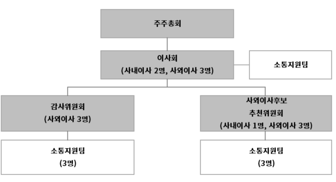 당사의 이사회는 회사의 최고 상설 의사결정기구로서 대표이사 선임 권한을 가지고 있습니다. 사외이사는 다양한 분야의 전문성과 풍부한 경험을 갖춘 자로 사외이사 후보추천위원회를 통해 추천되고 주주총회에서 주주의 결의로 선임 됩니다. 보고서 제출일 기준 이사회 총원 5명 중 사외이사는 3명으로 상법상 요건인 과반수를 충족하고 있습니다. 이사회 내 2개의 위원회(감사위원회, 사외이사후보추천위원회)를 운영하고 있으며, 위원회 내 구성원 비율은 사외이사를 과반수 이상으로 하고 있고, 감사위원회는 전원 사외이사로 구성하고 있습니다. 이와 같이 당사는 이사회, 경영진 및 사외이사가 상호 견제 및 균형을 갖추도록 선진 지배구조를 마련하고자 노력하고 있습니다. |